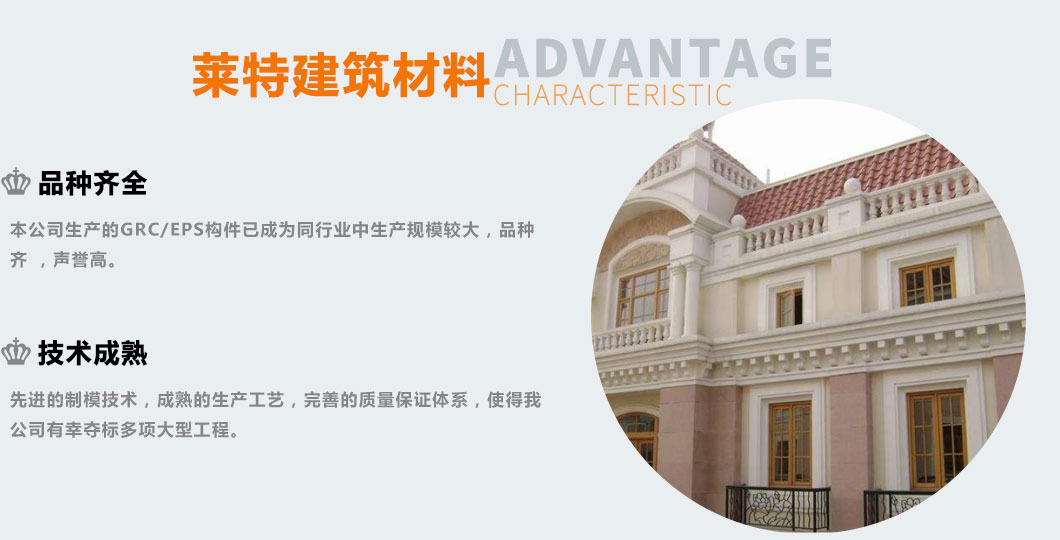 EPS/GRC產(chǎn)品是目前主導(dǎo)外墻裝飾的新型綠 色 環(huán) 保材料。較預(yù)制模板繁瑣的施工程序和高額的施工成本,更適用于安裝于外墻EPS,XPS保溫的墻體上。即能體現(xiàn)歐式、古典、高雅的裝飾風(fēng)格,又能保 證主體建筑外墻不出現(xiàn)冷、熱橋效應(yīng)。